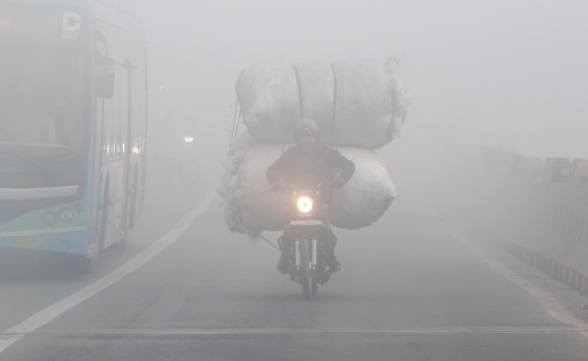 राजधानी दिल्ली में मंगलवार सुबह कड़ाके की ठंड और कोहरे के बीच से गुजरता बाइक सवार.