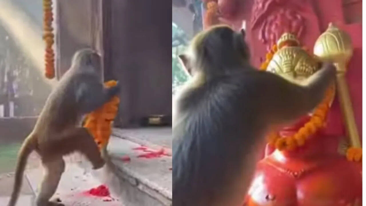 बजरंग बली के सामने बंदर हुआ भावुक, फूलों की माला पहनाकर दिखाई भक्ति