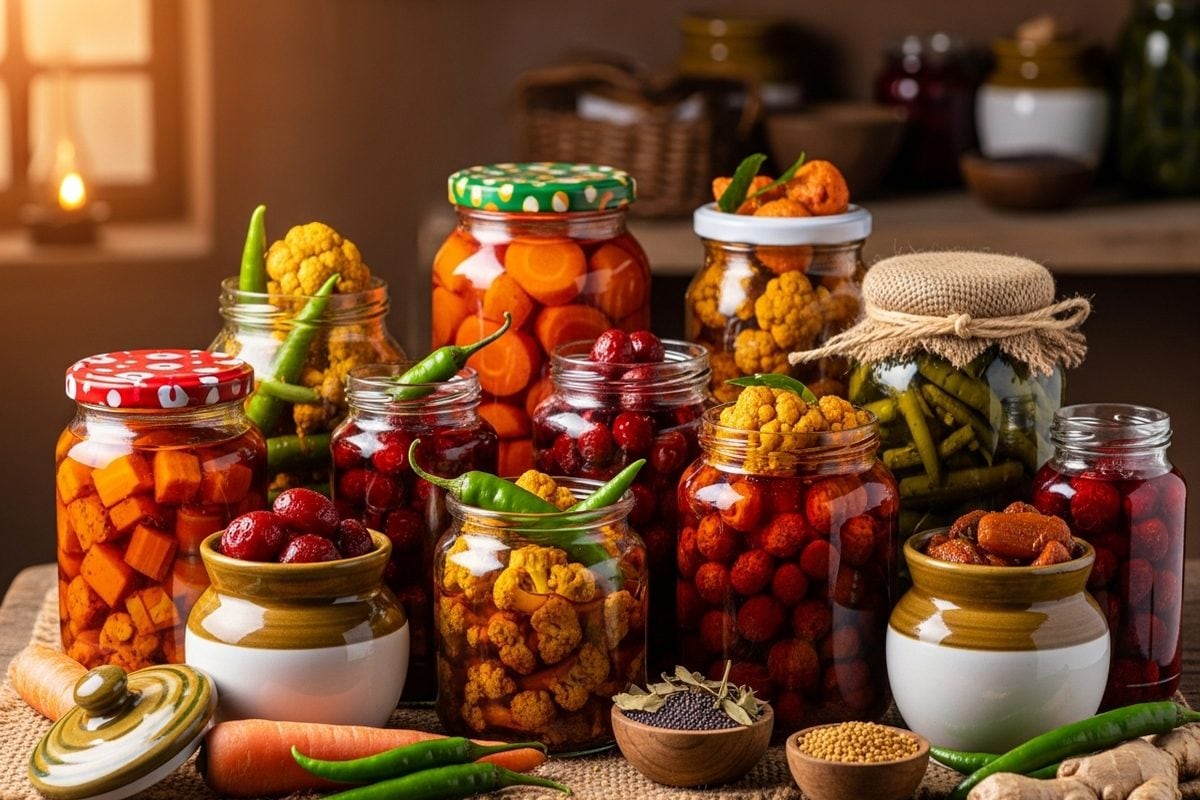 सर्दियों में गोभी‑गाजर‑मूली, हरी मिर्च, नींबू, मेथी, गोभी भरवा, करौंदा‑आंवला जैसे अचार ताज़ा स्वाद, मसालों और धूप की खुशबू के साथ बेहद लोकप्रिय हैं.