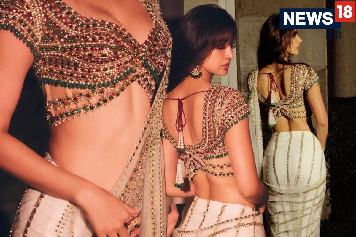 ट्रेडिशनल लुक में दिशा पाटनी का ग्लैमर, कर्वी बॉडी पर लपेटी मोती जड़ी साड़ी, डीप नेकलाइन ब्लाउज के आगे गहने फेल