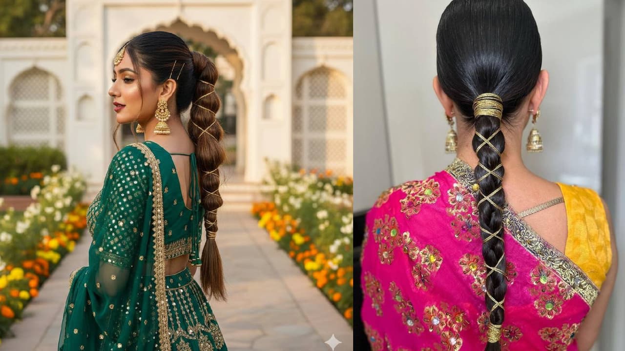 Golden Thread Hairstyle: घने, पतले या अनइवन बालों को सजाने के लिए गोल्डन थ्रेड से सजी हेयरस्टाइल बेस्ट ऑप्शन है। यह हेयरस्टाइल बालों की कमियों को छुपाकर फेस्टिव और एलिगेंट लुक देती है।