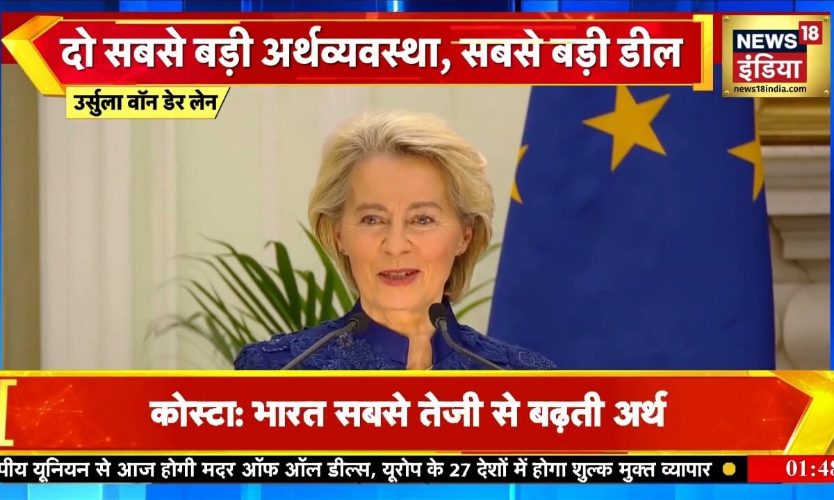 भारत और यूरोपीय संघ (EU) के बीच बहुप्रतीक्षित फ्री ट्रेड एग्रीमेंट (FTA) पर अब आधिकारिक मुहर लग गई है. यूरोपीय आयोग की अध्यक्ष उर्सुला वॉन डेर लेयेन ने इस समझौते को 'मदर ऑफ ऑल डील्स' करार दिया. उन्होंने कहा कि लंबी बातचीत के बाद आखिरकार यह बड़ी डील पूरी हुई है. उनके मुताबिक, इस समझौते से भारत और यूरोप के बीच व्यापार, निवेश और रोजगार के नए मौके पैदा होंगे और दोनों क्षेत्रों की अर्थव्यवस्था को नई रफ्तार मिलेगी. उन्होने पीएम मोदी को माय फ्रेंड कह कर संबोधित किया और कहा अद्वितीय मेहमाननवाजी के लिए बहुत-बहुत धन्यवाद. हमारे लिए यह आपके साथ होना एक बड़े सम्मान की बात थी.