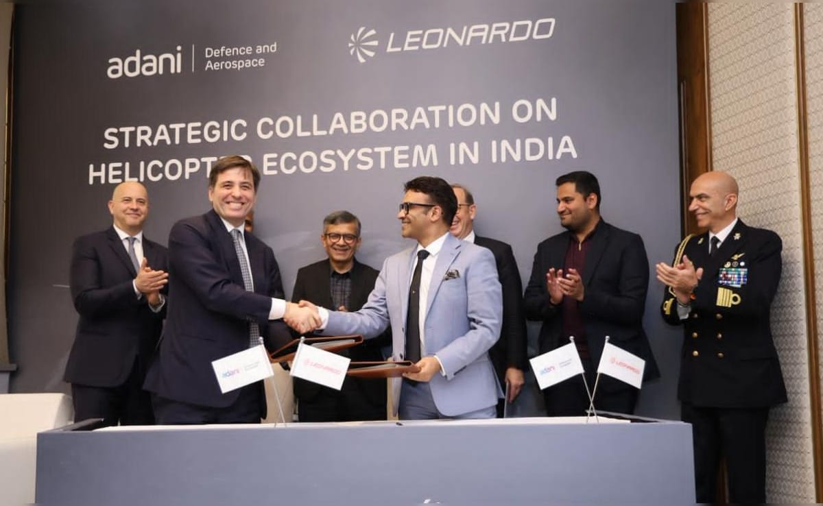 डील के बाद इटली की कंपनी लियोनार्डो के प्रतिनिधि के हाथ मिलाते अदाणी डिफेंस के प्रतिनिधि.
