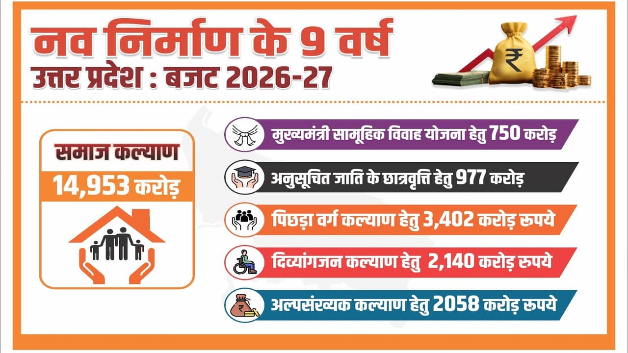 UP Budget 2026-27: योगी सरकार ने बजट 2026-27 में समाज कल्याण पर 14,953 करोड़ रुपये का प्रावधान किया है। सामूहिक विवाह अनुदान 1.01 लाख किया गया है। पेंशन, छात्रवृत्ति, पिछड़ा वर्ग, दिव्यांग और अल्पसंख्यक कल्याण योजनाओं में भी बढ़ोतरी की गई है।