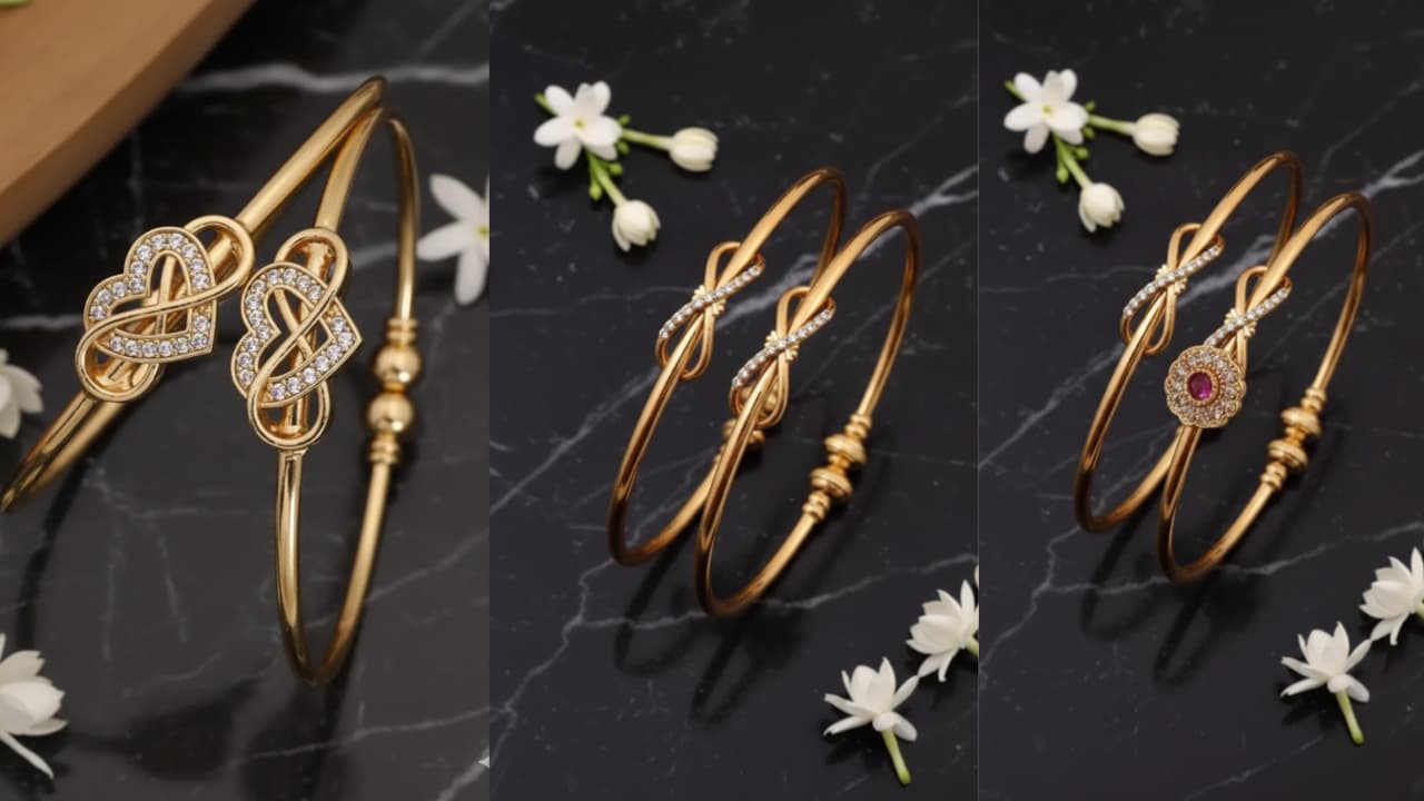 Sleek Gold Bangles for Bridal and Party Designs: स्लीक गोल्ड चूड़ी डिजाइंस उन महिलाओं के लिए शानदार हैं जो हल्के वजन में भी रिच और स्टाइलिश लुक चाहती हैं। लाल-सफेद स्टोन का कॉम्बिनेशन ट्रेडिशनल अपील देता है।