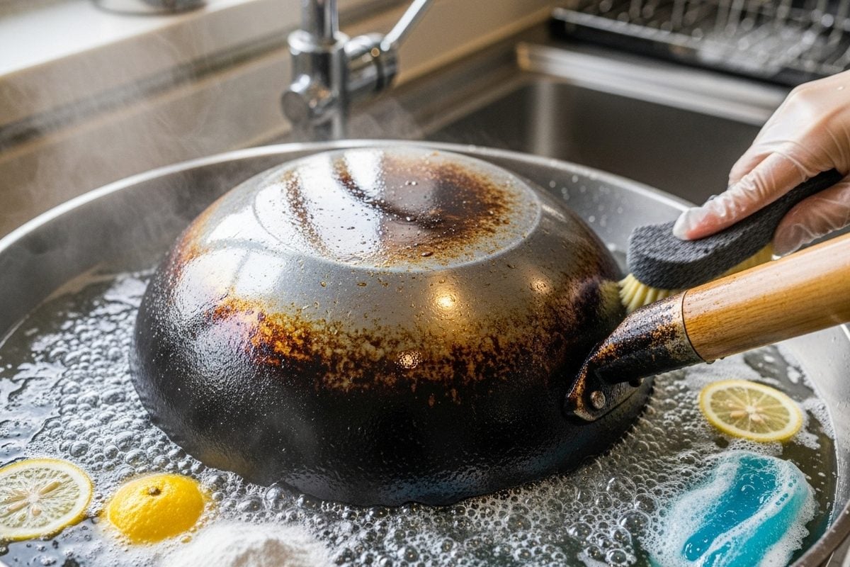 Kadai Handle Cleaning Tips: उबलते पानी में नमक, नींबू, बेकिंग सोडा और डिशवॉश मिलाकर कड़ाही डुबोने से जमी कालिख ढीली हो जाती है. हल्की रगड़ में हैंडल और बाहरी सतह मिनटों में चमक उठती है.