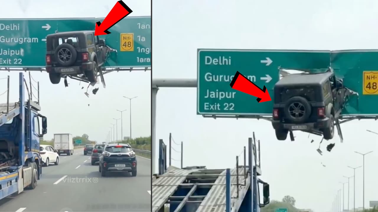 यह कारनामा सिर्फ थार ही कर सकता है, डायरेक्ट साइन बोर्ड में घुसाया-WATCH VIDEO