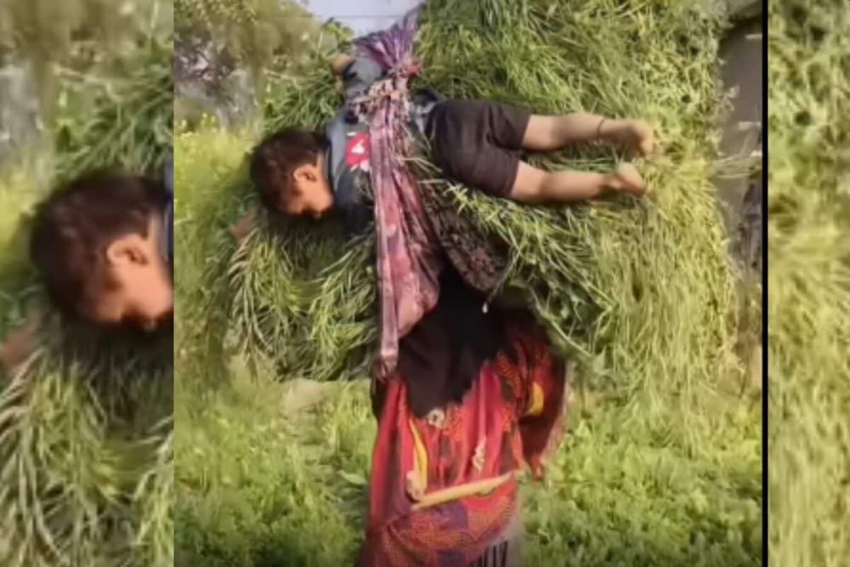 सिर पर घास का गट्ठर के साथ बांध लिया बच्चा, मां ने काम करते हुए ऐसे संभाला बच्चा!