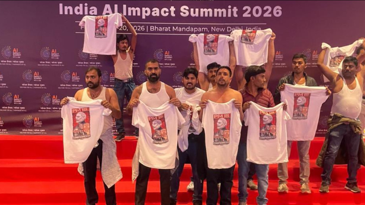 शुक्रवार को जब भारत मंडपम में दुनिया भर के दिग्गज आर्टिफिशियल इंटेलिजेंस पर चर्चा कर रहे थे, तभी यूथ कांग्रेस के लगभग 20 से 30 कार्यकर्ता वहां पहुंच गए। इन कार्यकर्ताओं ने हाल ही में हुई भारत-अमेरिका ट्रेड डील का विरोध करते हुए अचानक अपनी शर्ट उतार दी और अर्धनग्न होकर प्रदर्शन करने लगे। कार्यकर्ताओं ने प्रधानमंत्री को 'कॉम्प्रोमाइज्ड पीएम' बताते हुए नारेबाजी की।