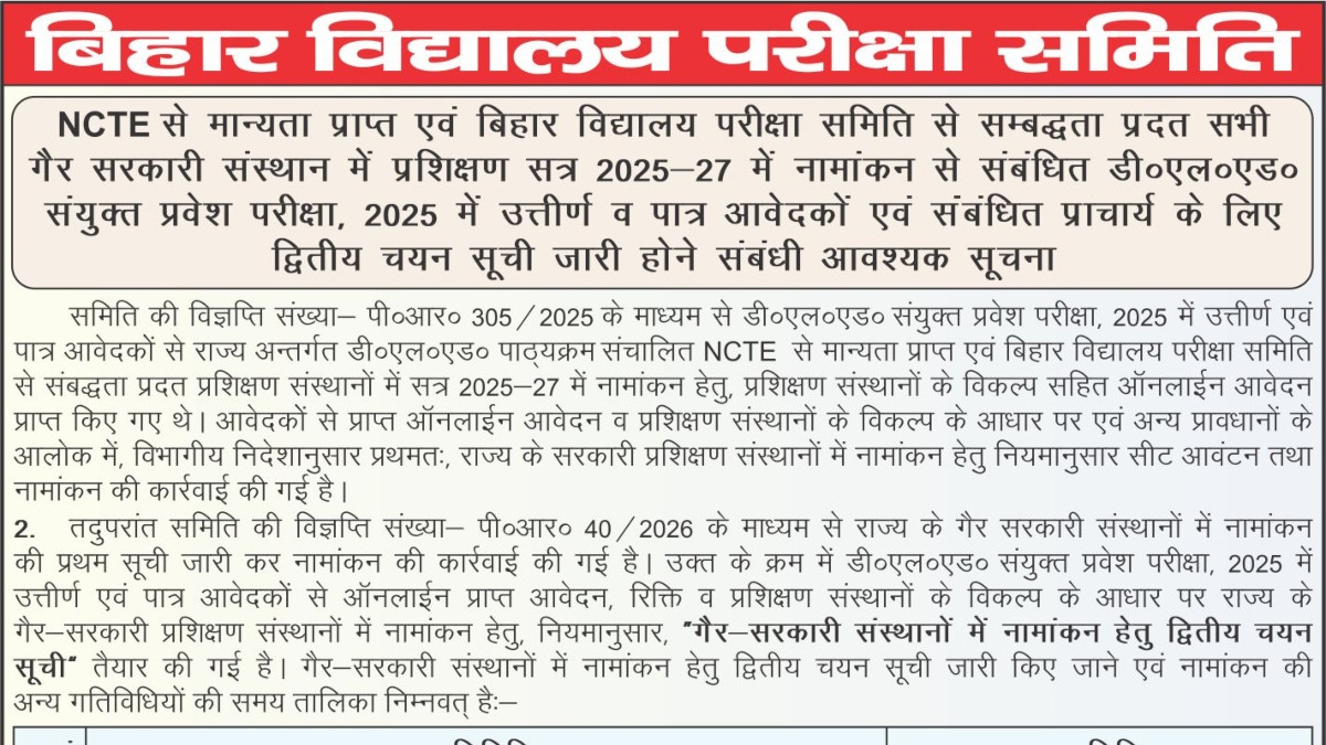 Bihar D.El.Ed Second Selection List: बिहार विद्यालय परीक्षा समिति (BSEB) द्वारा डिप्लोमा इन एलीमेंट्री एजुकेशन (D.El.Ed) में नामांकन की प्रक्रिया तेजी से आगे बढ़ रही है। बोर्ड ने आधिकारिक तौर पर घोषणा की है कि निजी संस्थानों के लिए बिहार डी.एल.एड की दूसरी चयन सूची (Second Selection List) रविवार, 22 फरवरी 2026 को जारी की जाएगी। जिन उम्मीदवारों ने इस प्रवेश परीक्षा में भाग लिया है और पहली सूची में स्थान नहीं पा सके थे, उनके लिए यह एक महत्वपूर्ण अवसर है।
