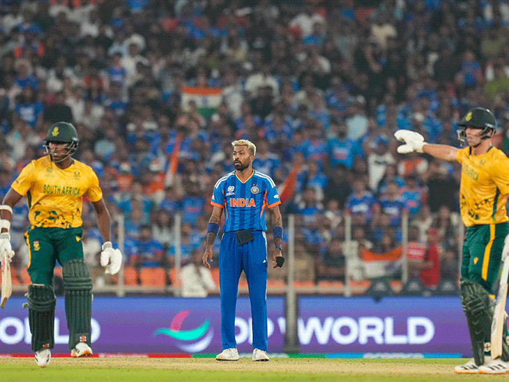 टी-20 वर्ल्ड कप 2026 में मेजबान भारत को पहली हार का सामना करना पड़ गया। रविवार को साउथ अफ्रीका ने टीम इंडिया को 76 रन के बड़े अंतर से हरा दिया। अहमदाबाद के नरेंद्र मोदी स्टेडियम में साउथ अफ्रीका ने 187 रन बनाए। भारत 111 रन ही बना सका। केशव महाराज ने एक ही ओवर में 3 विकेट झटक लिए। ओवर रेट पेनल्टी के कारण भारत को आखिरी ओवर में 5 खिलाड़ी 30 यार्ड सर्कल के अंदर खड़े करने पड़े। हार्दिक पंड्या ने रन आउट का मौका गंवाया, वहीं डेविड मिलर ने शिवम दुबे को जीवनदान दे दिया। IND vs SA मैच के टॉप मोमेंट्स... 1. भारत पर ओवर रेट की पेनल्टी लगी टॉस हारकर पहले बॉलिंग करने उतरी टीम इंडिया 20 ओवर पूरे करने के लिए निर्धारित 85 मिनट में 19 ओवर भी नहीं फेंक सकी। इस कारण टीम को आखिरी ओवर के लिए 4 की बजाय 5 खिलाड़ी 30 यार्ड सर्कल के अंदर खड़े करने पड़े। इसका खामियाजा भारत को भुगतना पड़ा और टीम ने 20वें ओवर में 20 रन खर्च कर दिए। 2. हार्दिक ने रन आउट का मौका गंवाया 20वें ओवर में हार्दिक पंड्या ने रन आउट का मौका भी गंवा दिया। ओवर की दूसरी गेंद हार्दिक ने यॉर्कर फेंकी, स्टब्स ने लॉन्ग ऑन की ओर गेंद पुश की और 2 रन के लिए दौड़ पड़े। स्टब्स तो स्ट्राइकर एंड पर पहुंच गए, लेकिन कगिसो रबाडा नॉन स्ट्राइकर एंड पर नहीं पहुंच पाए। फील्डर ने गेंद थ्रो की, लेकिन हार्दिक गेंद नहीं पकड़ पाए। अगर वे गेंद पकड़कर स्टंप्स को मार देते तो रबाडा आउट हो जाते। 3. स्टब्स ने 2 छक्के लगाकर खत्म की पारी साउथ अफ्रीका की बैटिंग के दौरान हार्दिक पंड्या गेंदबाजी से 20वां ओवर फेंकने आए। स्टब्स ने शुरुआती 2 गेंदों पर 2 डबल लिए, फिर तीसरी गेंद पर चौका लगा दिया। अगली गेंद लॉन्ग ऑफ की ओर गई, लेकिन स्टब्स ने रन नहीं लिया। उन्होंने फिर अगली 2 गेंदों पर छक्के लगाए और टीम का स्कोर 187 रन तक पहुंचा दिया। स्टब्स ने 24 गेंद पर 44 रन बनाए। 4. केशव महाराज को एक ओवर में 3 विकेट साउथ अफ्रीका के लेफ्ट आर्म स्पिनर केशव महाराज ने पारी के 15वें ओवर में 3 विकेट झटक लिए। तीनों विकेट कैच के रूप में रहे और हर बार कैच ट्रिस्टन स्टब्स ने ही पकड़ा। 5. डेविड मिलर ने शिवम दुबे का कैच छोड़ा भारत की बैटिंग के 16वें ओवर में शिवम दुबे को जीवनदान मिल गया। ओवर की पांचवीं बॉल कगिसो रबाडा ने ऑफ स्टंप के बाहर गुड लेंथ पर फेंकी। दुबे बड़ा शॉट लगाने गए, लेकिन गेंद कवर्स की दिशा में खड़ी हो गई। मिलर ने गेंद पकड़ने की कोशिश की, लेकिन गेंद उनके हाथ से छूट गई। जीवनदान के वक्त दुबे 32 रन के स्कोर पर थे, उन्होंने 42 रन बनाए।