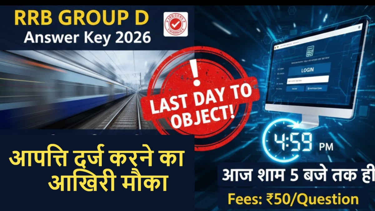 RRB Group D Answer Key 2026: रेलवे भर्ती बोर्ड (RRB) ग्रुप डी भर्ती परीक्षा 2026 की आंसर की पर आपत्ति दर्ज रने की आज अंतिम तारीख है। जिन अभ्यर्थियों को किसी प्रश्न या उत्तर पर संदेह है, वे शाम 5 बजे तक आधिकारिक वेबसाइट के माध्यम से अपनी आपत्ति ऑनलाइन दर्ज करा सकते हैं।