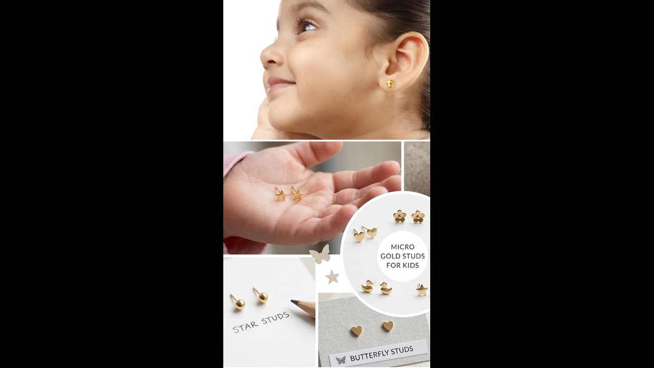 18kt yellow gold Micro Earrings Tiny studs 1 gram: माइक्रो गोल्ड स्टड ऐसे होने चाहिए जो क्यूट भी लगें और बड़े होने पर भी फैशन से बाहर न जाएं। फ्लावर, हार्ट, सिंगल स्टोन और हग्गी स्टाइल जैसे डिजाइन लॉन्ग-टर्म इनवेस्टमेंट हैं।