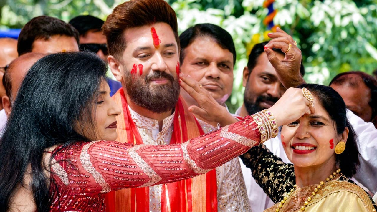 लाल गमछा-ब्लू चश्मा और गोल्डन कुर्ता में होली मनाने पहुंचे चिराग पासवान, किसने लगाया पहला रंग?