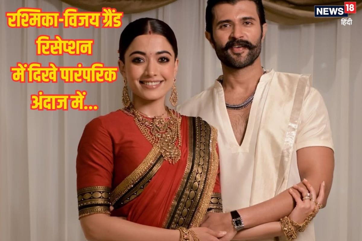 लाल साड़ी में बेहद खूबसूरत लगीं रश्मिका, क्रीम कलर के धोती-कुर्ता में छा गए विजय, वायरल हुआ रिसेप्शन लुक