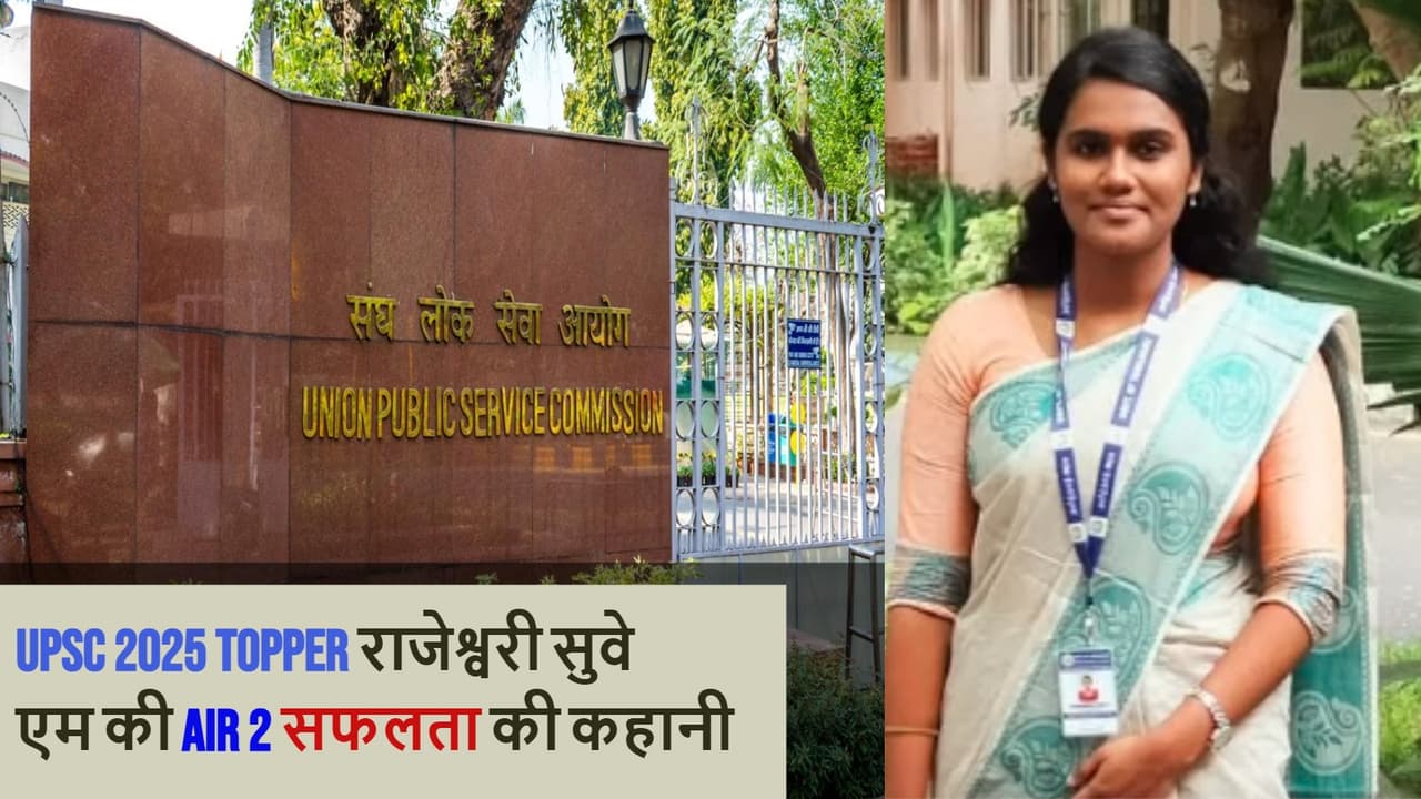 Rajeshwari Suve M UPSC Topper 2025 Success Story: यूपीएससी सिविल सेवा परीक्षा 2025 में राजेश्वरी सुवे एम ने ऑल इंडिया रैंक 2 हासिल कर पूरे देश का ध्यान खींचा है। तमिलनाडु के मदुरै जिले की रहने वाली राजेश्वरी ने इंजीनियरिंग के बाद कड़ी मेहनत और लगातार प्रयास से यह बड़ी सफलता हासिल की। जानें उनकी शिक्षा, UPSC जर्नी और सफलता की पूरी कहानी।