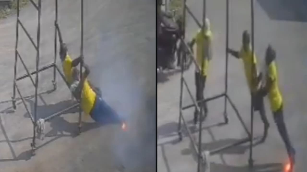 Painful Accident IN Telangana : तेलंगाना के मंचरियाल में, 11 kV बिजली लाइन के संपर्क में आए लोहे के स्टैंड से 2 मजदूरों की करंट लगने से मौत हो गई। यह दर्दनाक घटना सीसीटीवी में कैद हो गई, जिसका वीडियो वायरल हो गया है।