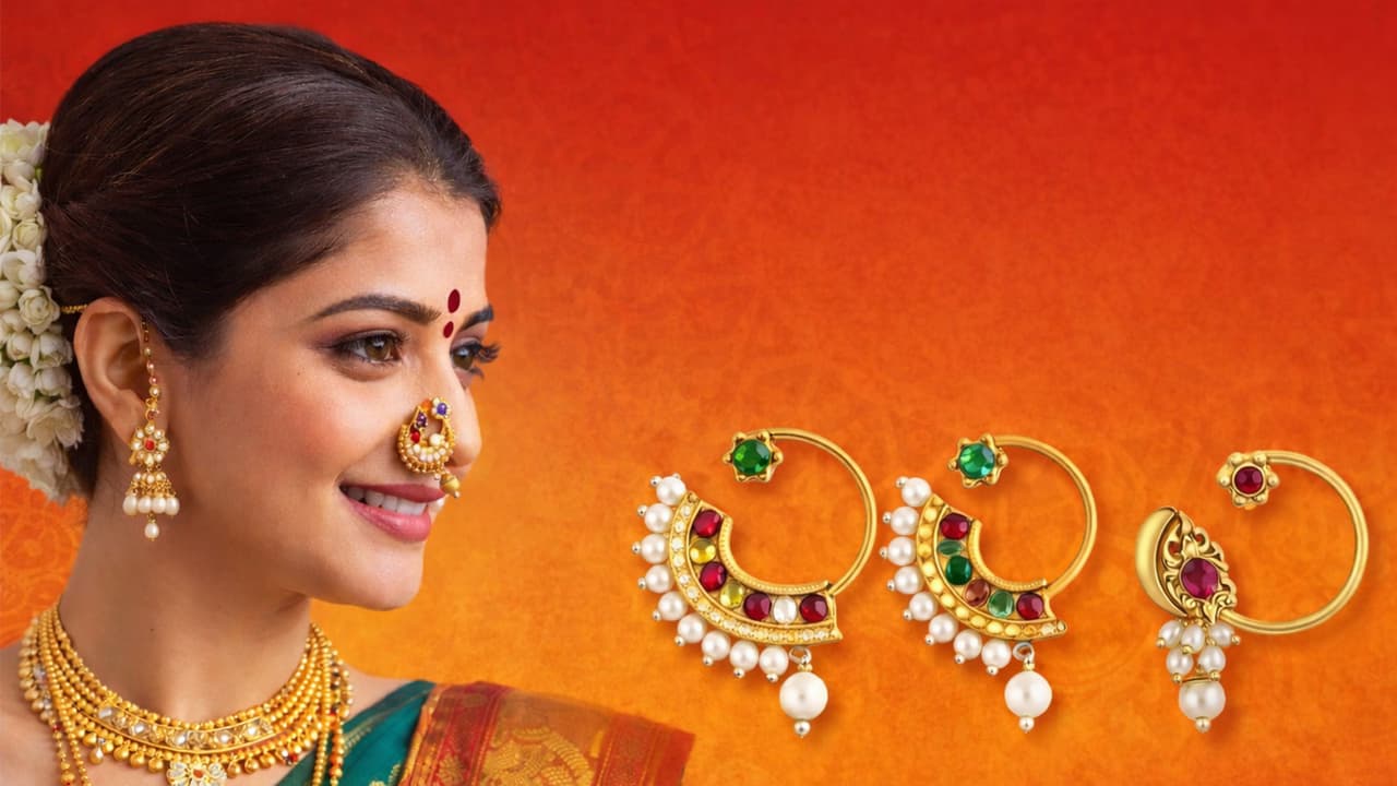 Gudi Padwa Nath Design: गुड़ी पड़वा पर ट्रेडिशनल मराठी लुक पाने के लिए पहनें पेशवाई नथ। जानें 1 से 1.5 ग्राम सोने में बनने वाली रूबी, एमराल्ड और पर्ल डिटेलिंग की लेटेस्ट नथ डिजाइन, जो हल्की होने के साथ बेहद रॉयल लगती हैं।