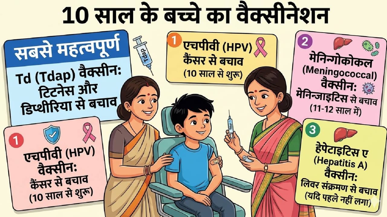 Vaccines for 10 year old children: 10 साल के बच्चों के लिए कुछ जरूरी वैक्सीन उनकी इम्युनिटी बढ़ाने और गंभीर बीमारियों से बचाने में मदद करती हैं। जानें इस उम्र में कौन-कौन सी वैक्सीन जैसे टिटनेस, डिप्थीरिया और अन्य बूस्टर डोज जरूरी हो सकती हैं।