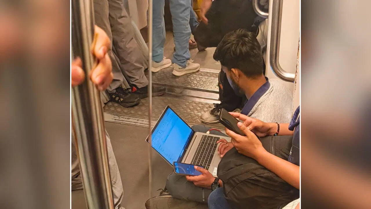 Delhi Metro में फर्श पर बैठकर लैपटॉप पर काम करता दिखा युवक, लोग बोले—ये डेडिकेशन है या शोषण?