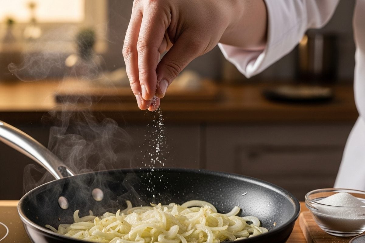 प्याज फ्राई करते समय नमक जल्दी नरम करता है और चीनी कैरेमलाइज़ेशन से सुनहरा रंग देती है. ग्रेवी में नमक पहले और रेस्टोरेंट-स्टाइल ग्रेवी के लिए अंत में चीनी डालें.