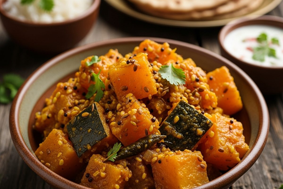 कद्दू की खट्टी मीठी सब्जी सरसों के तेल, राई, मेथी, अमचूर और गुड़ से बनी हल्की पचने योग्य डिश है, जिसे पूरी, कचौड़ी या पराठे के साथ परोसा जाता है.