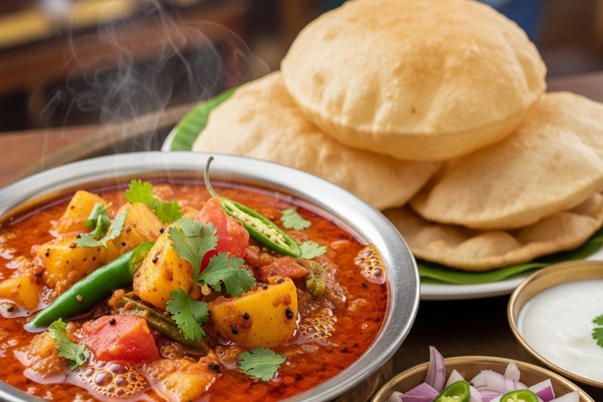 भंडारे वाली आलू की सब्ज़ी बिना प्याज़ लहसुन, सरसों के तेल, हींग और हल्के मसालों से बनती है, पतली रसेदार होती है और पूरी या कचौड़ी के साथ परोसी जाती है.
