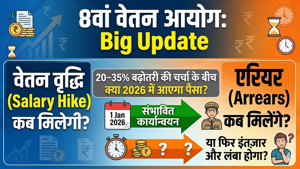 Big Update: 8वें वेतन आयोग की टाइमलाइन साफ़ हो गई है, लेकिन सैलरी बढ़ोतरी और एरियर मिलने में देरी संभव है। 20–35% हाइक और 1 जनवरी 2026 से एरियर की चर्चा के बीच कर्मचारियों को असली फायदा कब मिलेगा? क्या 2026 में पैसा आएगा या इंतज़ार और लंबा होगा?