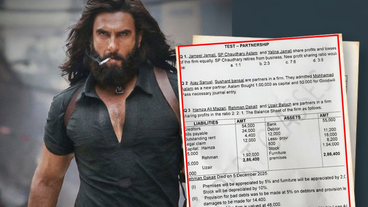 Dhurandhar Viral Exam paper: आदित्य धर की ब्लॉकबस्टर फिल्म धुरंधर और धुरंधर: द रिवेंज का क्रेज फैंस के बीच सिर चढ़कर बोल रहा है। हर तरफ फिल्म का चर्चा है और अब ये केवल सिनेमाघरों तक सीमित नहीं रहा, बल्कि क्लासरूम तक पहुंच गई है। हाल ही में एक अकाउंट्स एग्जाम पेपर सोशल मीडिया पर तेजी से वायरल हो रहा है, जिसमें फिल्म के मशहूर किरदारों के नाम शामिल किए गए हैं।