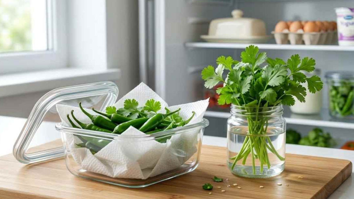 अगर आप चाहते हैं कि हरी मिर्च और हरा धनिया लंबे समय तक ताजे बने रहें, तो कुछ आसान स्टोरेज टिप्स अपनाना जरूरी है। सही तरीके से स्टोर करने पर ये हफ्तों तक फ्रेश रह सकते हैं। आइए जानते हैं 5 आसान और असरदार तरीके।