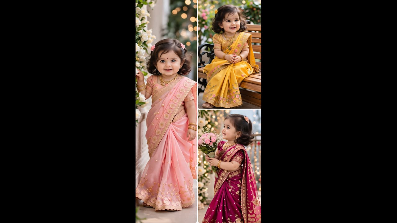 Baby Girls Saree Designs: आजकल बेबी गर्ल साड़ी लुक सोशल मीडिया पर काफी ट्रेंड में है, खासकर फेस्टिवल, वेडिंग और फोटोशूट के लिए। अगर आप भी अपनी लिटिल प्रिंसेस के लिए कुछ यूनिक और एथनिक लुक ढूंढ रहे हैं, तो ये क्यूट साड़ी आप देख सकती हैं।
