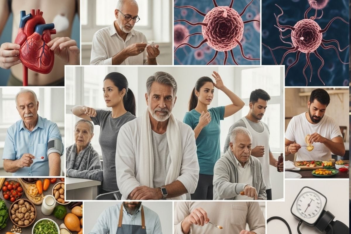 Health Risks in Indians: भारत में डायबिटीज, हाई ब्लड प्रेशर, हार्ट डिजीज और कैंसर जैसी बीमारियों के करोड़ों मरीज हैं. इस वजह से देश को डायबिटीज कैपिटल भी कहा जाता है. चिंता की बात यह है कि ये बीमारियां केवल बुजुर्गों तक सीमित नहीं हैं, बल्कि युवा भी तेजी से शिकार हो रहे हैं. डॉक्टर्स का कहना है कि सही लाइफस्टाइल और खान-पान से इनमें से कई बीमारियों से बचाव किया जा सकता है. समय पर हेल्थ चेकअप कराना भी बेहद जरूरी है, ताकि शुरुआत में ही इलाज हो सके.
