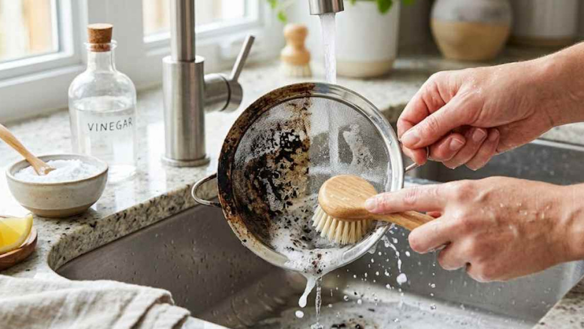 एक पैन में पानी डालें और उसमें थोड़ा सा बेकिंग सोडा या सिरका मिलाएं। अब इस पानी में छन्नी डालकर 5-7 मिनट तक उबालें। उबालने से जली हुई परत नरम हो जाती है और आसानी से निकल जाती है।