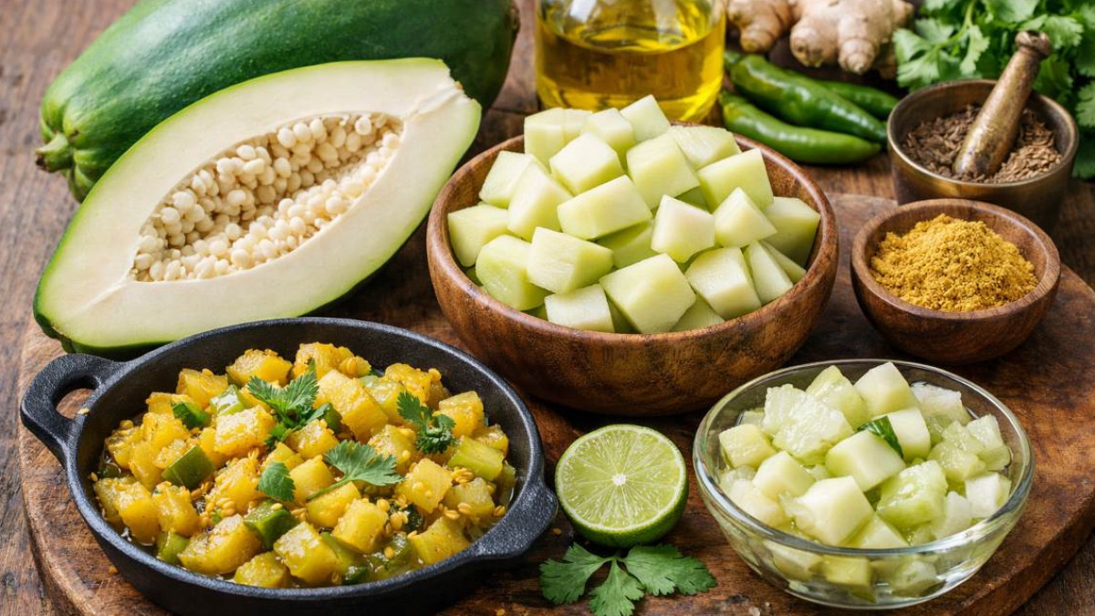 कच्चा पपीता वही फल है जो पूरी तरह पकने से पहले तोड़ा जाता है। इसका रंग हरा होता है और इसका स्वाद हल्का कड़वा या फीका होता है। इसे सब्जी, सलाद या जूस के रूप में खाया जाता है।