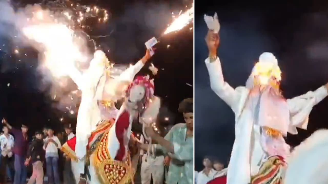 एक वायरल वीडियो में दूल्हे की बारात का जश्न उस वक्त खतरनाक हो गया, जब उसके हाथ में पकड़ी स्पार्कलर गन फट गई। दूल्हा घोड़ी पर बैठा था। इस घटना के बाद सोशल मीडिया पर शादियों में ऐसे पटाखों के इस्तेमाल के खतरों पर बहस छिड़ गई है।