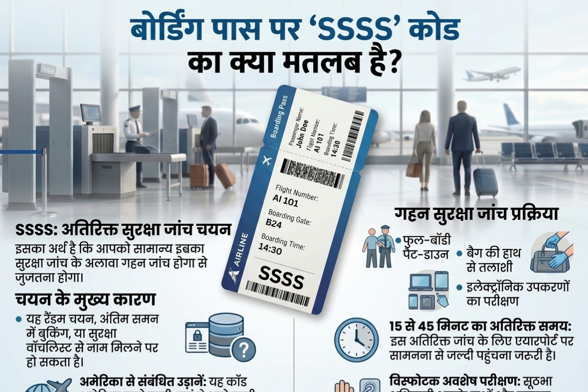 SSSS Code in Boarding Pass: यदि आपके बोर्डिंग पास पर 'SSSS' लिखा है तो थोड़ा सतर्क हो जाएं. आपको एयरपोर्ट पर अतिरिक्त सुरक्षा जांच का सामना करना पड़ सकता है. इस सुरक्षा जांच में आपके शरीर के साथ हैंडबैग की भी गहन जांच की जाएगी. यह जांच क्यों होती है, सभी पहलुओं को समझने के लिए पढ़ें आगे...